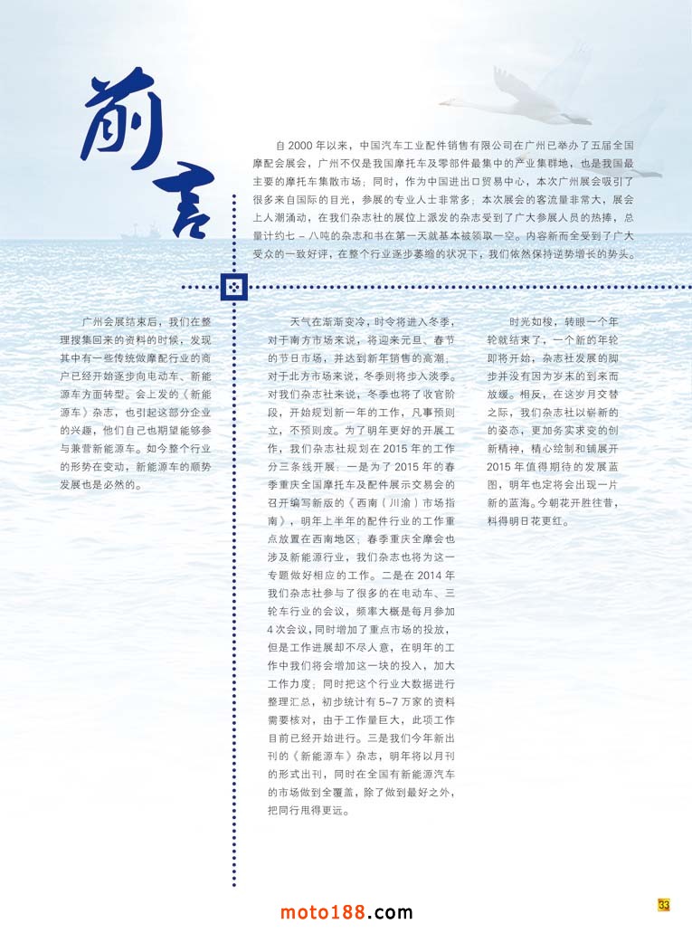 天氣在漸漸變冷,時(shí)令將進(jìn)入冬季,對(duì)于南方市場來說,將迎來元旦、春節(jié)的節(jié)日市場,并達(dá)到新年銷售的高潮;對(duì)于北方市場來說,冬季則將步入淡季。對(duì)我們雜志社來說,冬季也將了收官階段,開始規(guī)劃新一年的工作,凡事預(yù)則立,不預(yù)則廢。為了明年更好的開展工作,我們雜志社規(guī)劃在2015年的工作分三條線開展:一是為了2015年的春季重慶全國摩托車及配件展示交易會(huì)的召開編寫新版的《西南(川渝)市場指南》,明年上半年的配件行業(yè)的工作重點(diǎn)放置在西南地區(qū);春季重慶全摩會(huì)也涉及新能源行業(yè),我們雜志也將為這一專題做好相應(yīng)的工作。二是在2014年我們雜志社參與了很多的在電動(dòng)車、三輪車行業(yè)的會(huì)議,頻率大概是每月參加4次會(huì)議,同時(shí)增加了重點(diǎn)市場的投放,但是工作進(jìn)展卻不盡人意,在明年的工作中我們將會(huì)增加這一塊的投入,加大工作力度;同時(shí)把這個(gè)行業(yè)大數(shù)據(jù)進(jìn)行整理匯總,初步統(tǒng)計(jì)有5~7萬家的資料需要核對(duì),由于工作量巨大,此項(xiàng)工作目前已經(jīng)開始進(jìn)行。三是我們今年新出刊的《新能源車》雜志,明年將以月刊的形式出刊,同時(shí)在全國有新能源汽車的市場做到全覆蓋,除了做到最好之外,把同行甩得更遠(yuǎn)。