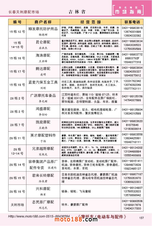 中國摩配市場從上世紀(jì)九十年代開始經(jīng)過高速度的發(fā)展,正逐步減速,摩托車行業(yè)也漸呈式微,與之緊密相關(guān)的后市場的配件與維修也呈逐步下滑之勢,取代摩托車的在發(fā)達(dá)地區(qū)是汽車,欠發(fā)達(dá)地區(qū)是電動(dòng)兩輪、電動(dòng)三輪,甚至電動(dòng)四輪車,隨著經(jīng)濟(jì)的發(fā)展,出行的多樣化,也給了消費(fèi)者多重的選擇。目前現(xiàn)有的摩托車及配件市場,也不再是以純摩托車為主體,有的市場電動(dòng)車取代了摩托車,有的商店也是混合經(jīng)營,這些變化在《市場指南》里面都有所反應(yīng)。這次《北方指南》一些小市場不再單列,并入到相應(yīng)的省份中去;以前去市場的公交線路,書中也不再列入,因?yàn)楝F(xiàn)在的地圖導(dǎo)航功能十分強(qiáng)大,既新又準(zhǔn)。