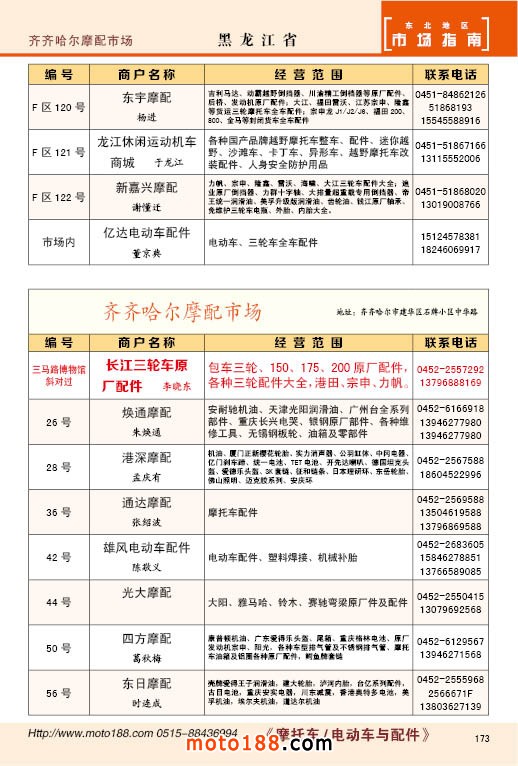 中國摩配市場從上世紀九十年代開始經(jīng)過高速度的發(fā)展,正逐步減速,摩托車行業(yè)也漸呈式微,與之緊密相關的后市場的配件與維修也呈逐步下滑之勢,取代摩托車的在發(fā)達地區(qū)是汽車,欠發(fā)達地區(qū)是電動兩輪、電動三輪,甚至電動四輪車,隨著經(jīng)濟的發(fā)展,出行的多樣化,也給了消費者多重的選擇。目前現(xiàn)有的摩托車及配件市場,也不再是以純摩托車為主體,有的市場電動車取代了摩托車,有的商店也是混合經(jīng)營,這些變化在《市場指南》里面都有所反應。這次《北方指南》一些小市場不再單列,并入到相應的省份中去;以前去市場的公交線路,書中也不再列入,因為現(xiàn)在的地圖導航功能十分強大,既新又準。