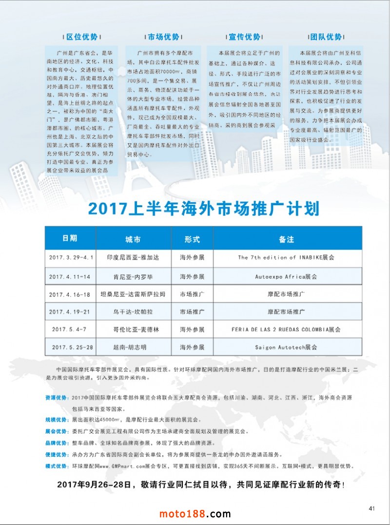 今年第73屆全國摩托車及配件展示交易會(huì)將在昆明召開,目前我們正在為會(huì)議進(jìn)行緊張的忙碌中。今年在會(huì)議上我們提供的資料是《西南地區(qū)市場(chǎng)指南》《會(huì)刊》《摩托車與配件》第五期雜志,歡迎大家到6130展位來領(lǐng)取。
