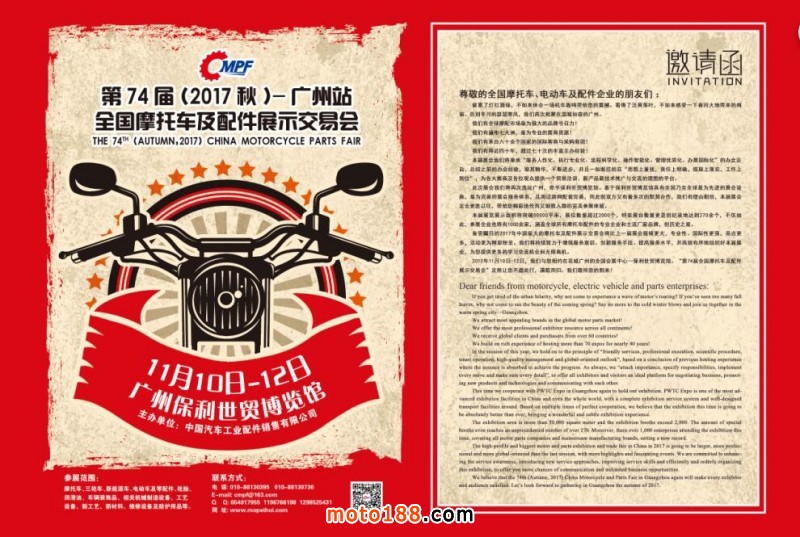 2017.7月《摩托車/電動車與配件》雜志,歡迎大家閱讀日期:2017-06-29 點擊:1130 查看原圖 全部展開![]() ![]() ![]() 彩拉 第74屆(2017秋)-廣州站全國摩托車及配件展示交易會邀請函