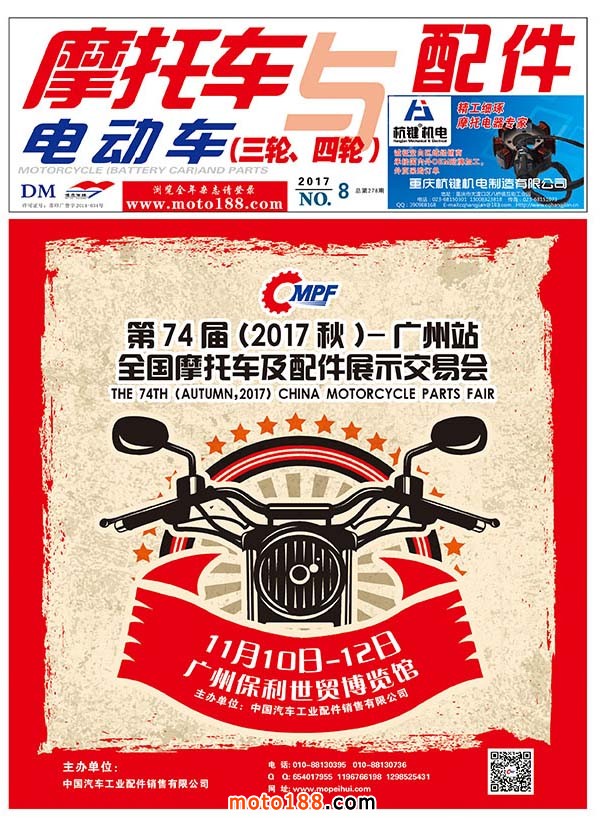 2017.8月《摩托車/電動(dòng)車與配件》雜志,歡迎大家閱讀日期:2017-07-31 點(diǎn)擊:2368 查看原圖 全部展開![]() ![]() ![]() 封面 第74屆(2017秋)-廣州站全國摩托車及配件展示交易會(huì)