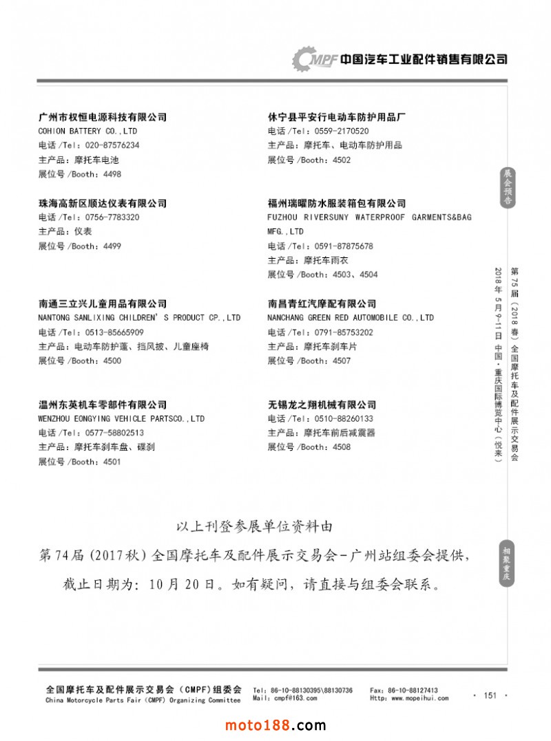 內151 第74屆(2017秋)全國摩托車及配件展示交易會-廣州站參展企業名錄