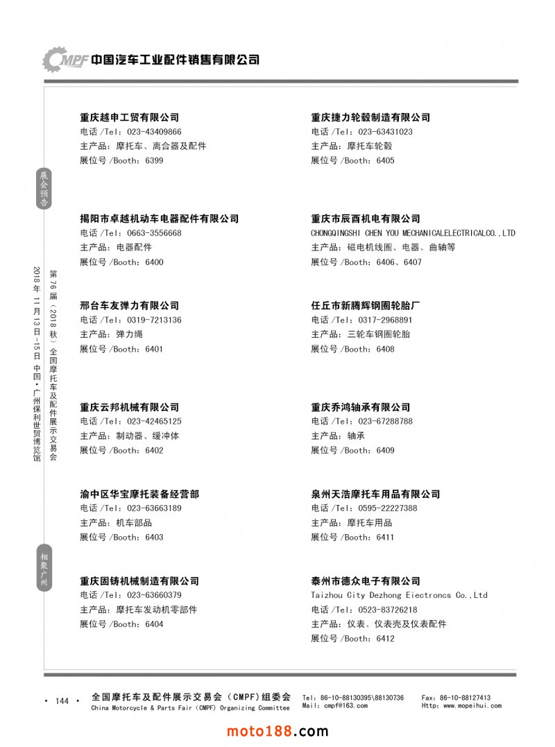 內(nèi)144 第75屆(2018春)全國(guó)摩托車及配件展示交易會(huì)-重慶站參展企業(yè)信息