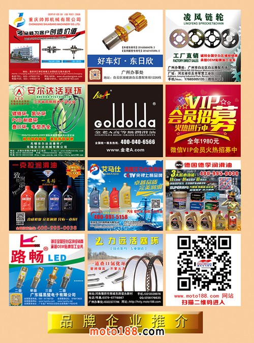從今年的6月到10月上旬,我們還將對16年編撰的《摩配華南市場指南》進行升級,中英文雙語出版,新版本將在下半年第76屆廣州全國摩托車及配件展示交易會首發;并在廣州重慶摩配市場全面派送;在廣州福星、松南市場門口、及白云210/002/607三個檔口常年設立發行窗口;發行至廣州、重慶、江浙的主要廠家,目前收集整理、核對校正信息,編排翻譯的工作正在進行之中,需要在最新《華南市場指南》升級版做宣傳的企業,請和我們以及各地的工作站人員聯絡。