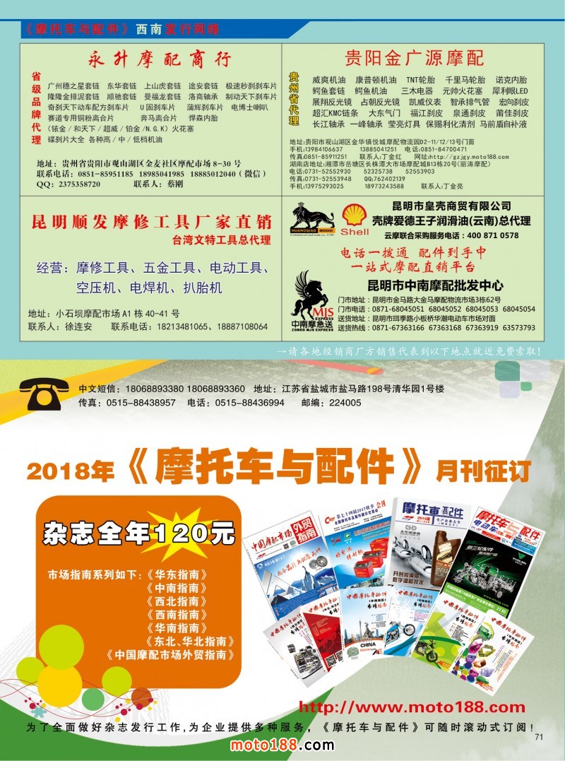 從現在到10月上旬,我們還將對16年編撰的《摩配華南市場指南》進行升級,中英文雙語出版,新版本將在下半年第76屆廣州全國摩托車及配件展示交易會首發,歡迎參展企業和參展觀眾到3109展位領取;在廣州、重慶摩配市場全面派送,在廣州福星、松南市場門口、及白云210/002/607三個檔口常年設立發行窗口;發行至廣州、重慶、江浙的主要廠家,目前收集整理、核對校正信息,編排翻譯的工作正在進行之中,需要在最新《華南市場指南》升級版做宣傳的企業,請和我們以及各地的工作站人員聯絡。