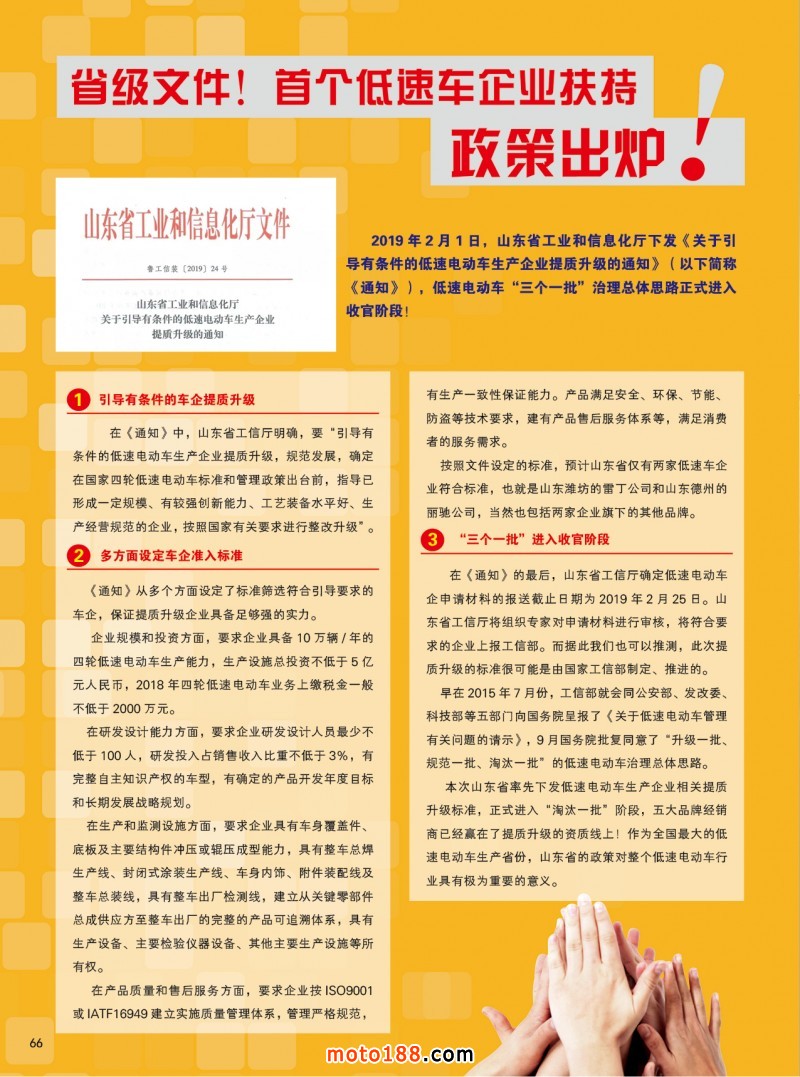 在這個(gè)春天里我們感受到和風(fēng)拂面,我們更堅(jiān)定了信心,我們傳統(tǒng)媒體務(wù)實(shí)的發(fā)展和經(jīng)營(yíng),基礎(chǔ)工作在不斷的加厚夯實(shí),今年我們雜志進(jìn)行了大調(diào)整,一年只在銷售季里出刊,全年出刊四期精品,本期雜志就有許多重要信息發(fā)布:政策面上的行業(yè)和地方上的重要政策(如前所述),18年的市場(chǎng)數(shù)據(jù)匯總分析,通機(jī)產(chǎn)品技術(shù)介紹 ,行業(yè)有關(guān)的重要國(guó)際資訊,國(guó)際巨頭研發(fā)生產(chǎn)的情況動(dòng)態(tài),電摩行業(yè)電動(dòng)三四輪及動(dòng)力電池最新的國(guó)家和地方政策,從海量的信息里精挑細(xì)選,每一遍文章都能讓讀者開卷有限,同時(shí)還值得收藏。