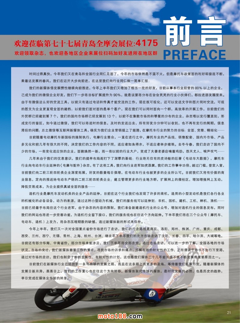 2019.5月《摩托車(chē)/電動(dòng)車(chē)與配件》雜志,歡迎大家閱讀日期:2019-05-08 點(diǎn)擊:1860 查看原圖 全部展開(kāi)![]() ![]() ![]() 內(nèi)21 前言