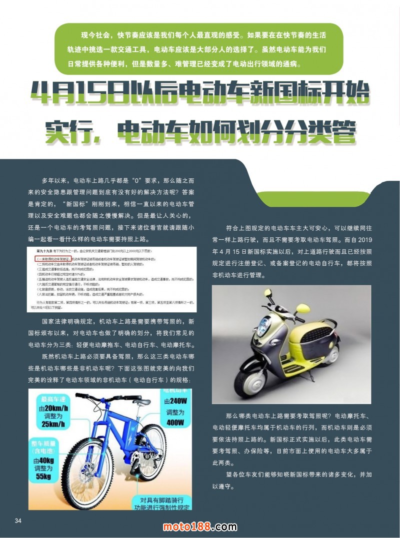 2019.5月《摩托車/電動車與配件》雜志,歡迎大家閱讀日期:2019-05-08 點擊:1860 查看原圖 全部展開![]() ![]() ![]() 內(nèi)34 4月15日以后電動車新國標(biāo)開始實行,電動車如何劃分分類管