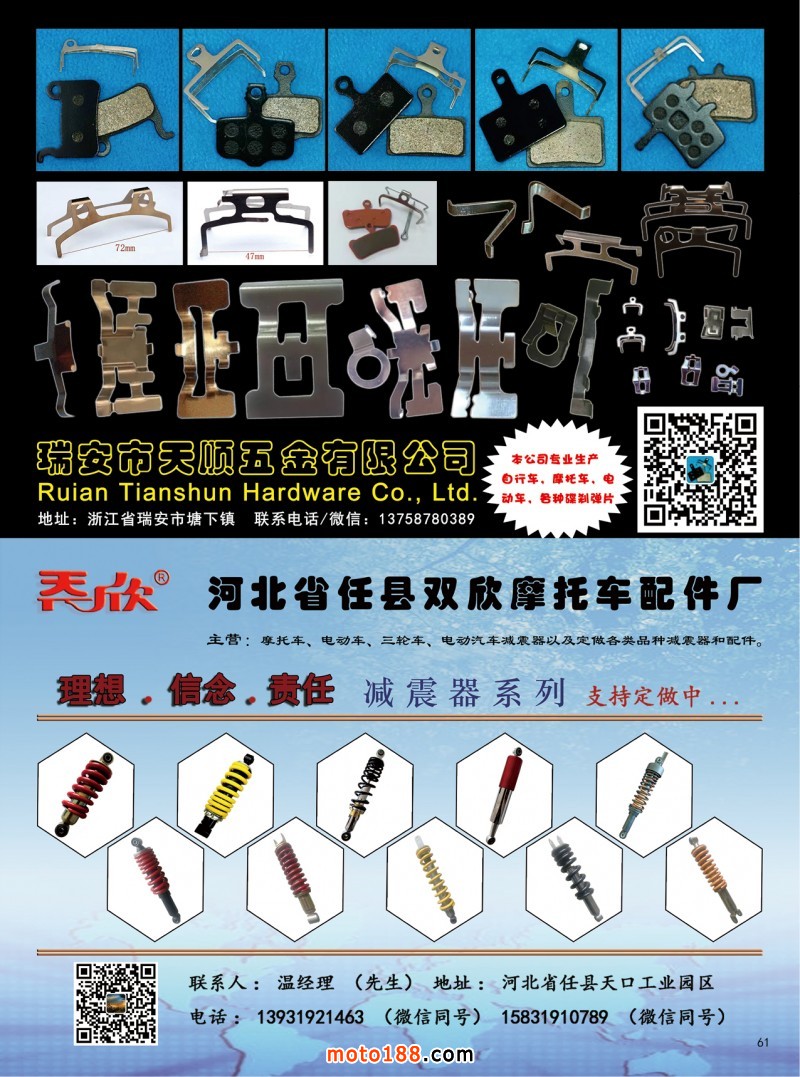 2019.5月《摩托車/電動車與配件》雜志,歡迎大家閱讀日期:2019-05-08 點擊:1838 查看原圖 全部展開![]() ![]() ![]() 內61 瑞安市天順五金有限公司