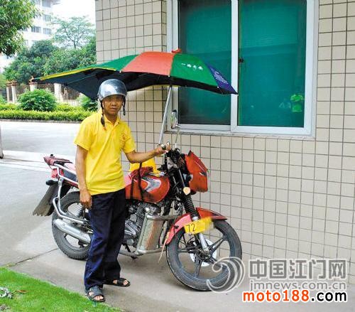 6月13日早上,江海交警大隊一中隊民警和協管員在東海路設卡對過往車輛進行檢查。9時許,執勤民警遠遠就發現有一輛加裝了一把大傘的兩輪摩托車迎面駛來,馬上示意該車靠邊停車接受檢查。湖南籍的駕駛員何××說:“最近天氣時雨時晴,我想摩托車也像小汽車那樣遮風、擋雨、防曬,所以就加裝了一把遮陽傘。”執勤民警對其進行嚴肅的批評教育,責令何××馬上將傘拆除,并依法暫扣該違法車輛,作進一步處理。