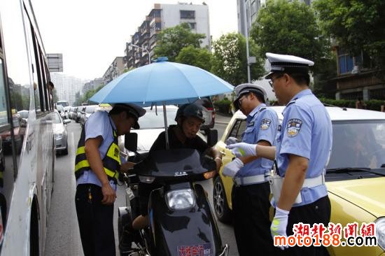 宜昌西陵交警現(xiàn)場查扣加裝遮陽傘的摩托車