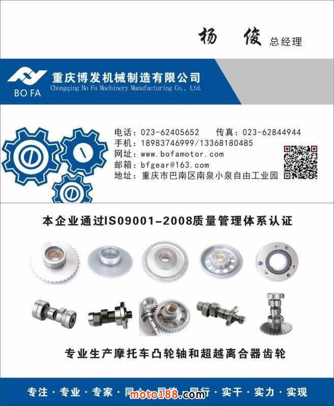 重慶博發(fā)機(jī)械制造有限公司專業(yè)生產(chǎn)摩托車各型凸輪軸,產(chǎn)品規(guī)格齊全、種類豐富。目前與重慶宗申、力帆、隆鑫、廣州天馬、北方易初等各大主機(jī)廠配套,質(zhì)量讓用戶滿意,價格讓用戶驚喜?,F(xiàn)誠尋區(qū)域經(jīng)銷商和外貿(mào)客戶,歡迎來電咨詢洽談(免費索樣)聯(lián)系人:楊總:13368180485