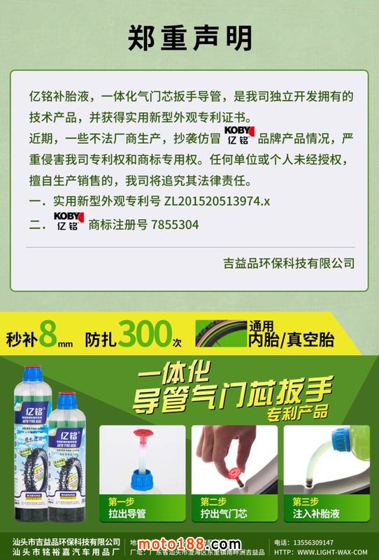 吉益品環??萍加邢薰局圃焐?銘裕嘉汽車用品廠成立于1992年,致力于摩托車養護精細化工產品,產品種類多達上100款,“齊全”而“精致”。聯系人:陳生 13556309147
