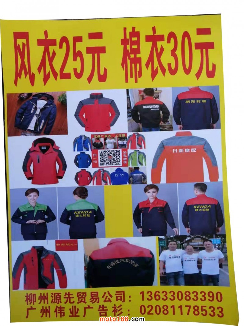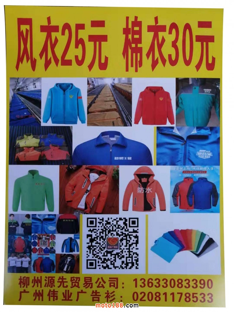 10元一件純棉T恤!25元一件風衣!30元一件棉衣,偉業廣告衫專業設計生產銷售高中低檔!促銷服,團隊服,棉服,工衣,聚會衫!校服班服,職業裝,勞保服,球衣,廣告禮品等!廣州,廣西,重慶,無錫,鄭州,有大型印花廠,出貨快,質量好,歡迎新老客戶定制!微信電話同號:13633083398廣州偉業廣告衫,柳州市源先貿易有限公司,袁生