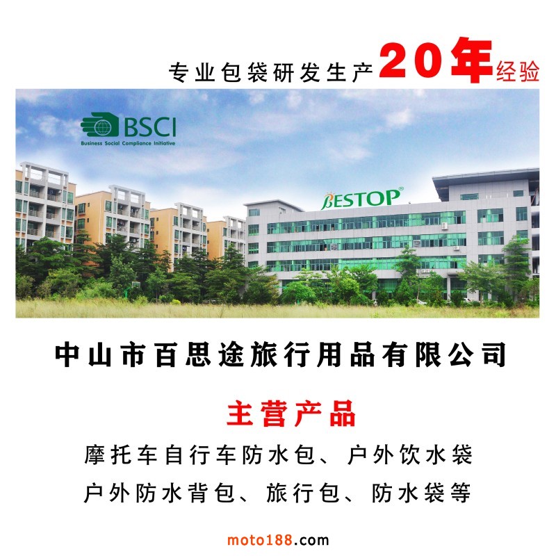 中山市百思途旅行用品有限公司,專業包袋研發生產20年經驗,主營產品:摩托車自行車防水包、戶外飲水袋、戶外防水背包、旅行包、防水袋等,聯系電話:18476582442,周小姐