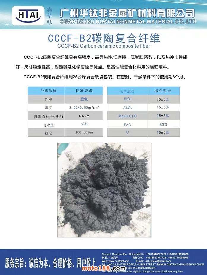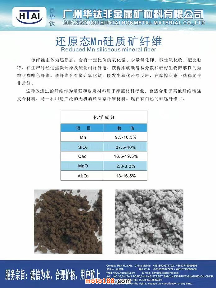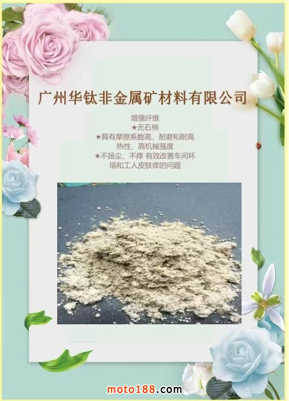 廣州華鈦非金屬礦材料有限公司:專業(yè)服務(wù)剎車片和密封材料行業(yè),主要產(chǎn)品:樹(shù)脂,各種纖維,金屬纖維,助劑和填料。歡迎各位朋友來(lái)電洽談。電話:18520377722