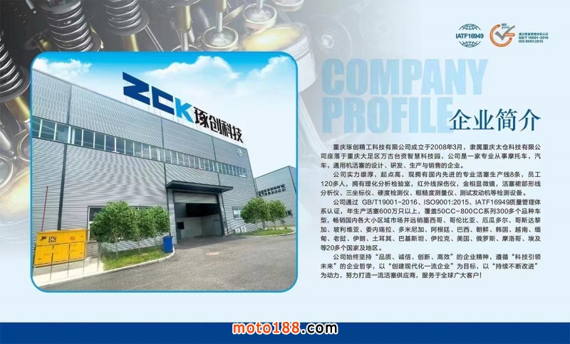 是一家專業從事摩托車,汽車,通用機活塞的設計、研發、生產與銷售的企業。 公司通過GB/T19001-2016 ISO9001:2015ATE16949質量管理體系認證,年生產活塞800萬只以上,覆蓋50CC-800CC系列300多個品種車型,暢銷國內各大小區域市場并遠銷墨西哥、哥倫比亞、厄瓜多爾、哥斯達黎加、玻利維亞、委內瑞拉、多米尼加、阿根廷、巴西、朝鮮、韓國、越南、緬甸、老撾、伊朗、土耳其、巴基斯坦、伊拉克、美國、俄羅斯、摩洛哥、埃及等20多個國家及地區。