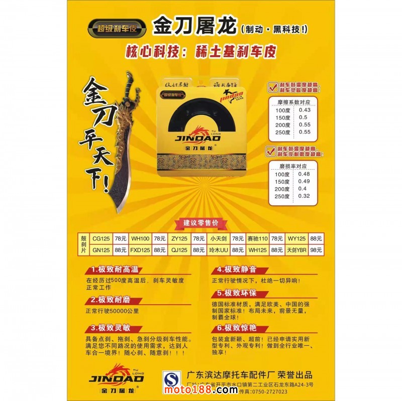 未來已來!!!金刀屠龍剎車皮是一款劃時代的產品。它是中國摩托車行業中第一款,以高含量稀土元素材料為基礎生產的摩托車制動系列。誠邀眼光獨到的您,強強聯合、群策群力共同爆破財富之門!