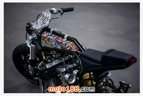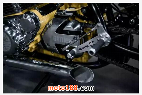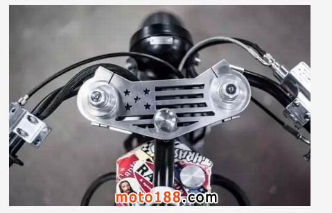 為了彌補新的駕駛位置和比較低的油箱設計,Karl在機車的尾端增加了新的元素來襯托低線條的玻璃纖維油箱。因此機車的線條看起來更加清晰,外形也更具有攻擊性。Karl也用了一些獨特的皮革扣件來固定大燈,這一靈感源于福特野馬。除了噴漆的油箱,Karl和他的顧客同意增加一些保守的元素,用溜冰品牌的貼紙粘貼在油箱上,可以起到一定的保護作用,而且也比較酷。