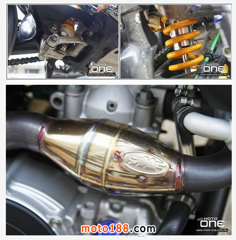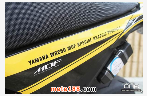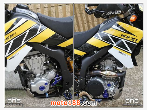 首先全車貼上MDF YAMAHA 60周年經典拉花貼紙,外觀鮮明而突出,加上車主放棄了原廠的鋼絲輪框,選用了輕巧優質的MARCHESINI前、後鍛造輪圈,令這supermotard更具街車的風格。與此同時,前制動用上法國的BERINGER鑄鐵浮動前煞車碟盤、前煞車卡鉗、煞車總泵等組合,制動效能明顯更優於原廠。全車還有?HLINS TTX 後避震器、FMF 排氣管、AFAM 28mm 轉向把手、尾齒盤及繁多的改裝部件,令此YAMAHA WR250X呈現更佳的制動力、操控性、舒適感及美觀度。而詳盡的改裝清單可看以下的「YAMAHA WR250X 改裝內容」,一目了然。