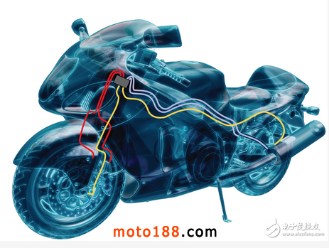 在ABS制動系統中,用輪速傳感器或音輪測量機車駕駛速度。ABS電子控制單元(ECU)中的微控制器(MCU)利用這些測量結果判斷車輛是否將停轉。這種情況發生時,MCU向ECU中的集成電路(IC)發出模擬混合信號(AMS) ,驅動液壓閥并調整制動缸對踏板的壓力。這種制動可每秒發生幾次。圖3顯示了這些制動單元在摩托車上的位置。