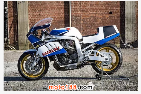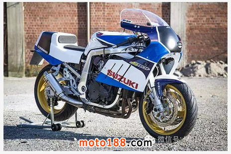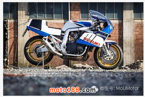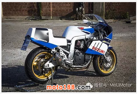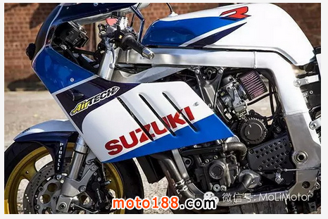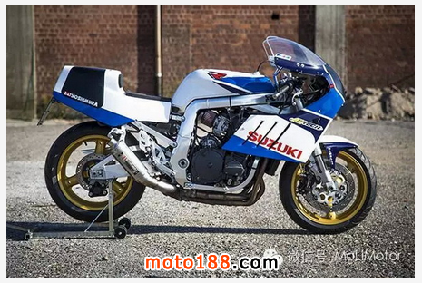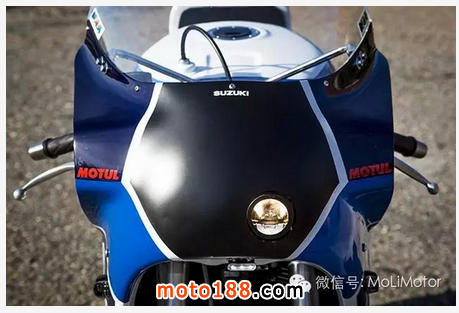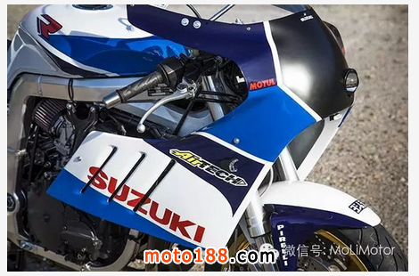復(fù)古車配件,讓他成為終極的道路使用車. 他發(fā)現(xiàn)在美國(guó)有一家Airtech公司有生產(chǎn)整套AMA Yoshimura F1 復(fù)刻版整流罩, 馬上訂購(gòu)把東西送到德國(guó)準(zhǔn)備烤漆與貼紙的制作, 第一件事情就是把所有整流罩噴成北極白,Suzuki專用的配色,還有貼上贊助商貼紙!