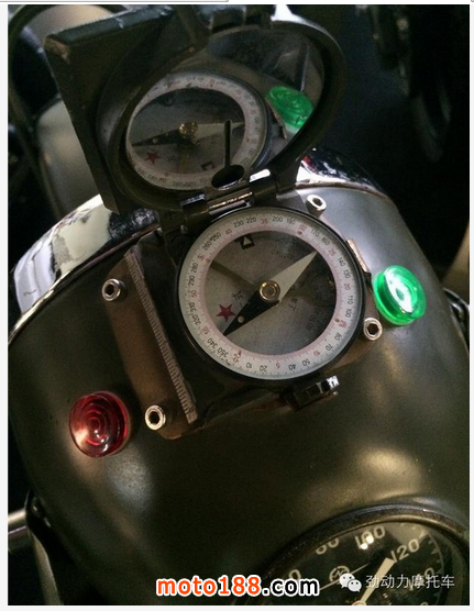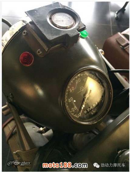 原車裝配的速度表集成在前大燈燈殼上方,同時作為一款軍用摩托車,車主還為它加裝了指南針。