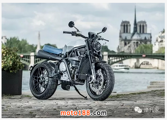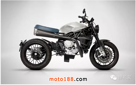 這輛Lara 800是基于MV Agusta Brutale 800打造,原車本來就擁有出色的性能,無論是機械還是電子件幾乎都用上了最好部件,因此基于此打造出的Scrambler性能毋庸置疑。Lara 800絕對是一輛陽剛氣十足的車,激進的車身設計向外界傳達出的訊息不言而喻。而手工打造的一體式鋁合金油箱及車座上包裹著高等級的藍色皮革,細致的做工加之完美的比例,又透出一股法蘭西式低調奢華。
