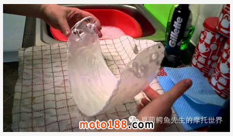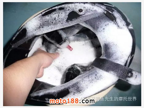 將頭盔整個浸入裝滿溫度適宜,加了中性洗衣液的水盆中,然后用軟毛的小刷子對頭盔內部和不能拆下的內襯進行刷洗。