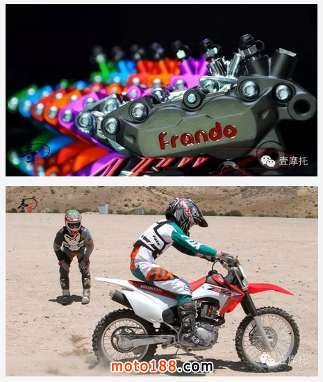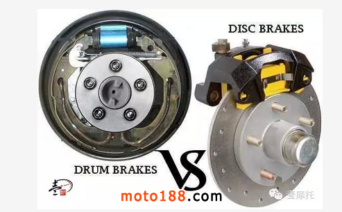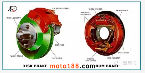 碟式剎車:在制動時由上泵產生壓力推動剎車油管內的剎車油,剎車油再將剎車下泵也就是我們俗稱的剎車卡鉗內的活塞推出,活塞擠壓剎車片讓剎車片與剎車盤摩擦產生制動力。