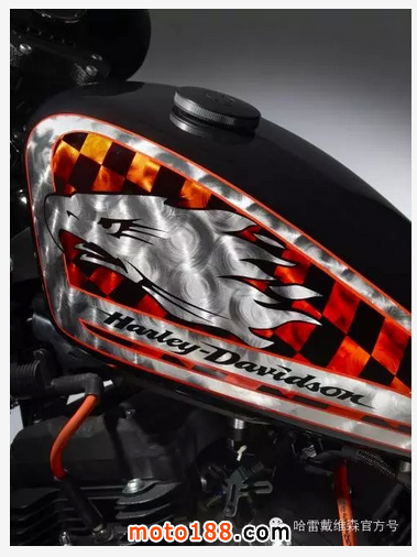 △ 這款油箱來自全新哈雷戴維森Street 750摩托車,金屬制淚滴形油箱用硬質(zhì)冷鋼鍛造及優(yōu)質(zhì)噴漆打造而成。