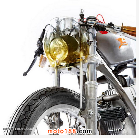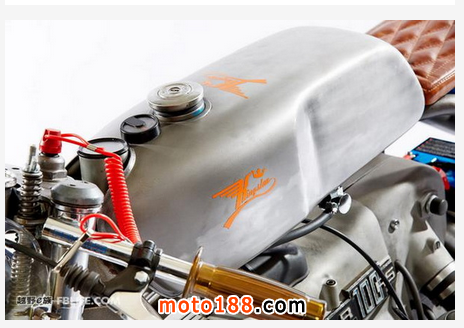 改裝完了引擎就該對車架還有外形進行定做,Dirk走的仍然是復(fù)古路線。軟管和線束從外面幾乎看不見,非常整潔。并且也對啟動機和汽油泵的位置進行了謹慎的重新調(diào)整,使得整車看起來非常的緊湊。車架也進行了最大化的縮減,這樣也能搭載上Dirk自己改裝的可調(diào)節(jié)式避震器,預(yù)壓縮行程為36mm。從車頭方向看,現(xiàn)代感超強的前照燈搭配上復(fù)古感極強的燈罩,這樣的視覺反差也給人一種更獨特的感覺。