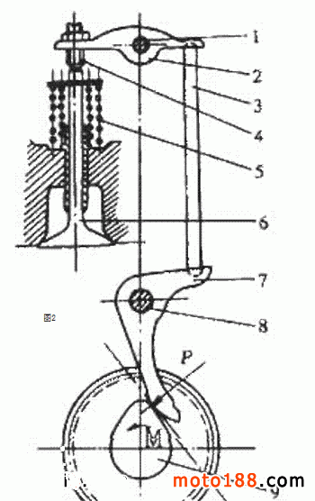 4. 為什么柱銷稍有松動,便會產生較大的敲擊聲呢?這要從整個配氣機構來分析;如圖 1-24 所示,氣門彈簧產生的彈力,通過上搖臂、氣門推桿、下搖臂作用于凸輪上的 M 點,力的方向如圖2 中 P 的方向,使凸輪產生逆時針轉動的趨向;當凸輪隨齒輪轉過一個角度后,作用力點移至 M ‘,方向變為 P ‘的方向,使凸輪產生順時針轉動的趨向,如圖 1-25 所示;正是由于這個力的方向周期性地改變,使圓柱銷子與銷孔兩側碰擊而發出聲響。