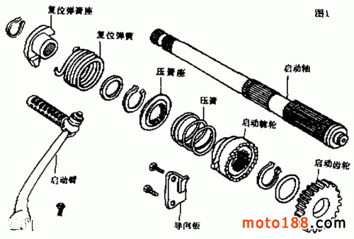 啟動時,踩下啟動臂,啟動軸轉動,啟動軸上的啟動棘輪也隨之轉動;啟動棘輪外圓上的凸塊脫離導向板限制,棘輪被壓簧推向啟動齒輪,并與啟動齒輪側面的棘齒嚙合,使啟動齒輪同步轉動;然后通過副軸和主軸上的一擋齒輪及處于結合狀態的離合器,將動力傳遞到發動機曲軸上,并最終啟動發動機。啟動后,駕駛者迅速放松啟動臂,在復位彈簧作用下,啟動軸反轉,啟動棘輪上的凸塊沿著導向板的斜面上移,使棘輪與啟動齒輪脫開嚙合。這樣,啟動齒輪只是在啟動軸上空轉,而不帶動啟動軸。如啟動后未及時松開啟動臂,則啟動齒輪與啟動棘輪的棘齒之間處于打滑狀態,以防損壞啟動機構。