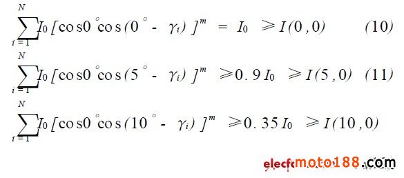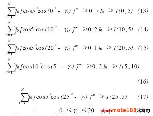 將對應的國標規(guī)定的各測點的光強值代入公式(10) 到公式(18) ,通過MA TLAB 求解出方程組的滿意解,即采用3 ×5 的排布,γi 為(0 , ±5°, ±10°) ,即每行5 個L ED 采用柱面型排布。