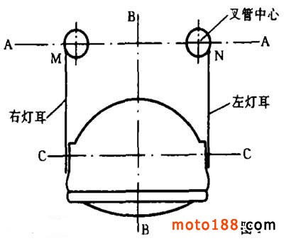 摩托車(chē)被碰撞后前照燈光束偏射,大都是由于燈耳彎曲、叉管彎曲、上下聯(lián)板相對(duì)位置偏移而引起。將這些零件整直矯正,如果忽視燈耳與套連接的根部位置 M 與 N (圖1)的位置恢復(fù),是很難使光束正射的。