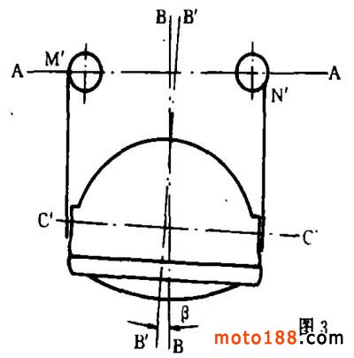 CC 與 AA 平行否,與 M 、 N 點(diǎn)位置有關(guān)。經(jīng)過(guò)撞偏以后的前照燈(見(jiàn)圖2),修復(fù)時(shí),由于往往只注意將燈耳整直,忽視了 M 、 N 點(diǎn)的位置,使 M 、 N 的正確位置移動(dòng)成 M′、N′位置(見(jiàn)圖3 ),使 C′C ′與 AA 不平行,前照燈光束仍然偏射。偏射方向 B′B′與正射方向 BB 成一角度 β 。