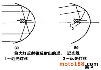 2. 反射鏡的構成及特點反射鏡一般俗稱“燈碗”。前燈燈泡的遠光功率一般為 20 ~ 80W ,近光功率一般為 10 ~ 35W ,但目前使用規格一般為 12V35W/35W 燈泡。在這樣的功率下,散射光線只能照明車前 3 ~ 5m 的路面,所以,摩托車前照燈都設有反射鏡。它將燈泡的散射光線聚合反射成向前或向前下方的平行光線,如圖2 。