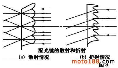 3. 配光鏡的構成及特點配光鏡又稱散光玻璃、大燈玻璃。經反射鏡反射出來的光線雖提高照射距離和強度,但光線太窄,不能照亮摩托車前方路面的必要區域。為此,在大燈燈泡前設一塊散光玻璃。它用透光玻璃壓制而成,內表面制成凸凹不平的復雜幾何形狀,形成許多特殊的棱鏡和透鏡,如圖3 所示。其作用是將反射鏡反射出來的平行光束進行折射利散射,使車前路面一定區域內得到均勻的照明。