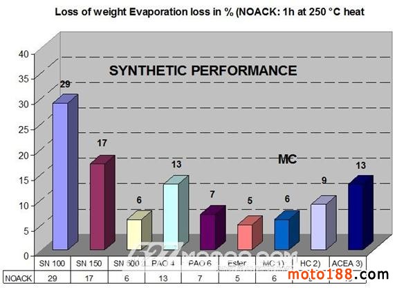 而來自瑞士的Motorex,在250度的高溫環境下,持續運轉1小時,驗證機油在這樣的環境下會損失多少機油量。經過一小時的測試,經由SN100提煉法的礦物油,燒機油現象達到29%,而采用PAO與Ester等提煉方式的基礎油,僅損失7%、5%,因此可比較出礦物油與”真正”全合成機油的差異性。