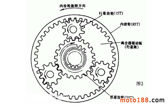一、行星齒輪機構裝在曲軸左端的行星齒輪機構是名流 CH100 踏板車三擋自動變速器中低速時減速傳動的決定性機件。當發動機轉速超過 3000r/min 時,自動離心式 1 擋離心塊在離心力作用下向外甩開,與離合器外盤的內表面緊密接觸,使離合器處于接合狀態。這樣一來,固定在外盤上的環形內嚙合齒輪開始旋轉,與內嚙合齒輪相嚙合的行星齒輪也隨著旋轉,位于中心的恒星齒輪(太陽輪)與行星齒輪也相嚙合,但在棘爪式單向旋轉離合器作用下,行星齒輪只能在恒星齒輪上面一面滾動,一面作行星環繞太陽式的公轉,然后將這個公轉運動的旋轉力傳給鏈輪。令人驚奇的是,行星齒輪的轉速慢于環形內嚙合齒輪(齒圈)的轉速,即獲得了減速。見圖 2 。