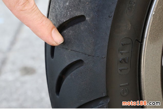 輪胎不是磨到胎紋全平,變成「光頭胎」再換就好,這種「光頭胎」與比賽用的光頭胎完全不一樣,雖然輪胎接地面積的確增加了,但是由于無法排水、排砂,因此容易導致摔車。因此胎紋在剩下一定深度時,就必須要更換。在檢查胎紋時,我們要先找到胎紋凸點,在輪胎側面每90度就可以找到一個三角形或是廠牌特有的標記,沿著這個標記對應到輪胎胎紋,就能看到胎紋內有個凸起的部分,當這個凸起的部分與胎面齊平時,就代表輪胎需要更換了。