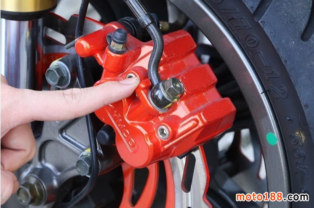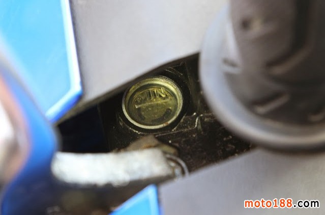 檢查完拉桿作動后,接下來要檢查煞車油,檢查剎車油量必須將車輛駕立中柱,并且確認龍頭打直,然后從拉桿旁看進去剎車總泵,上面會有個圓形的檢查窗口,通常在窗口上或窗口旁會有刻度,當油量低于刻度代表必須補充煞車油量,同時檢查煞車油是否干凈、清晰。足夠剎車油量是確保剎車時不會有空氣跑進油管,使剎車效果減弱甚至失靈,如果發現油量較上次檢查減少過多,則需要檢查油管是否有漏油,以及來令片是否有異常的快速磨耗。