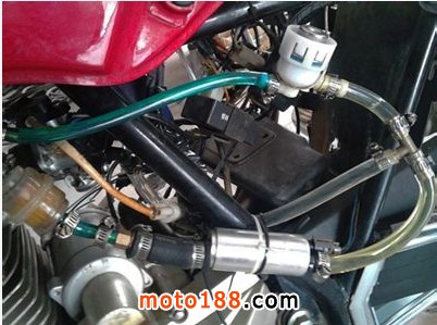 下面是燃油泵組的安裝,燃油泵一定要比油箱低,廠家說明書要求的,估計是為了方面下油吧,需要注意的是燃油泵一定要裝在車架內,不然車子一倒給壓壞了你就哭吧(下面的圖是為了方便展示給大家看所以放在了外面)