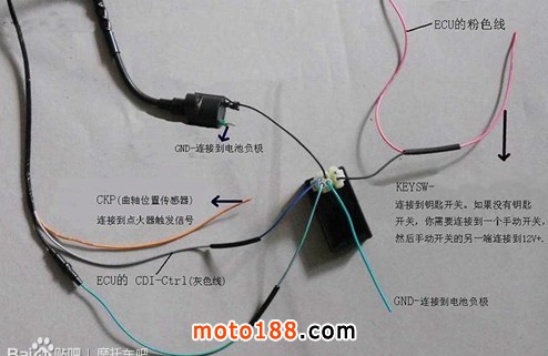打開鑰匙開關,但不要啟動發動機,這時候你會聽到油泵里發出運行的聲音,大概5秒時間,如果油泵沒有動作,那你肯定把某些線連接錯誤了,好好查查吧,當聲音停止下來時就說明ECU開始工作了。