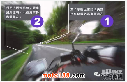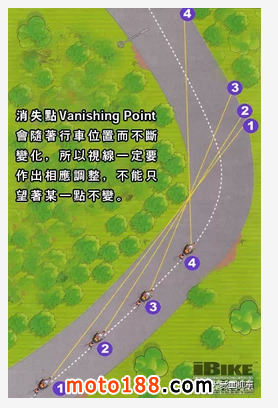 如果入彎前的車速是在駕駛者所能應付的能力之內(nèi)的話,「消失點」會和駕駛者穩(wěn)定地保持著一定的距離,大部份情況都會是兩、三個車位的距離。但若果駕駛者的轉(zhuǎn) 向能力未能及時消化彎道的變化時,「消失點」便會急速地向駕駛?cè)说姆较蚩拷砣霃澦俣冗^高,超出騎士本人的轉(zhuǎn)向能力,減速是唯一辨法,否則人車恐怕會 沖出彎道之外.....