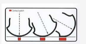 矢力是另一個影響牽引力的因素。它的工作原理是這樣的:無論是前輪還是后輪,越靠外部分的輪胎的膠皮的周長,會比靠內輪胎膠皮的周長要短,這就意味著,在同樣的時間內,外部膠皮通過的距離會比內輪胎膠皮通過的距離長,這樣,外部膠皮通過同樣距離的速度會比內輪胎膠皮要快。內輪胎膠皮通過速度慢,從而造成了對速度快的外部膠皮的拖拽,這樣就產生了牽引力,既可以清理橡膠“死皮”,也會幫助車輛保持穩定的走線。