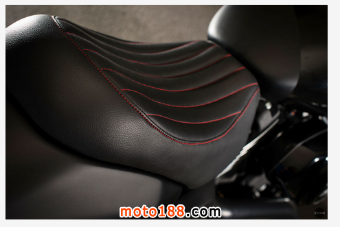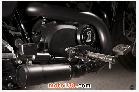 在原裝座椅上安裝了一個(gè)定制坐墊,重置了點(diǎn)火鎖和喇叭使外觀看起來更加簡潔一體。在廉價(jià)摩托車上會(huì)看到的線束也被部分隱藏。中控噴上黑漆并打孔裝上了哈雷的“Silencer”腳踏。