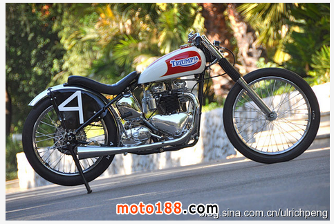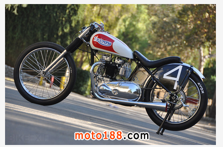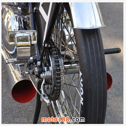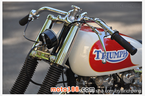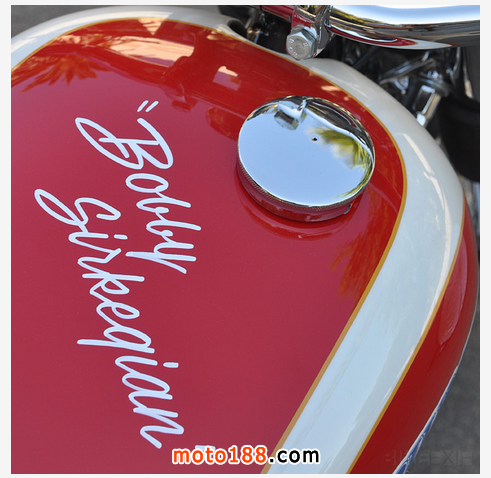 這臺1951年出廠的凱旋雷鳥被Sirkegian翻修一新,但完全保留了當年的原貌。當初為了適應南加州賽車協(xié)會SCTA的要求,整車的動力系統(tǒng)都被加以強化,發(fā)動機在拓缸后換上了特制的040大尺寸曲軸連桿和小號的正時齒輪,改裝的缸頭為發(fā)動機增加了進氣和排氣量。這臺雷鳥當時參加的是650cc組別的直線競速,如今我們開來倒是臺很拉風的美式Bobber,尤其是將排氣管里面漆成紅色,真是悶騷到了極點。這不最近時裝設計師 Christian Louboutin 就正在和圣羅蘭YSL因紅色高跟鞋底的設計專利打著如火如荼的官司,看來全世界的男人真的都很喜歡這種驚鴻一瞥的美感。